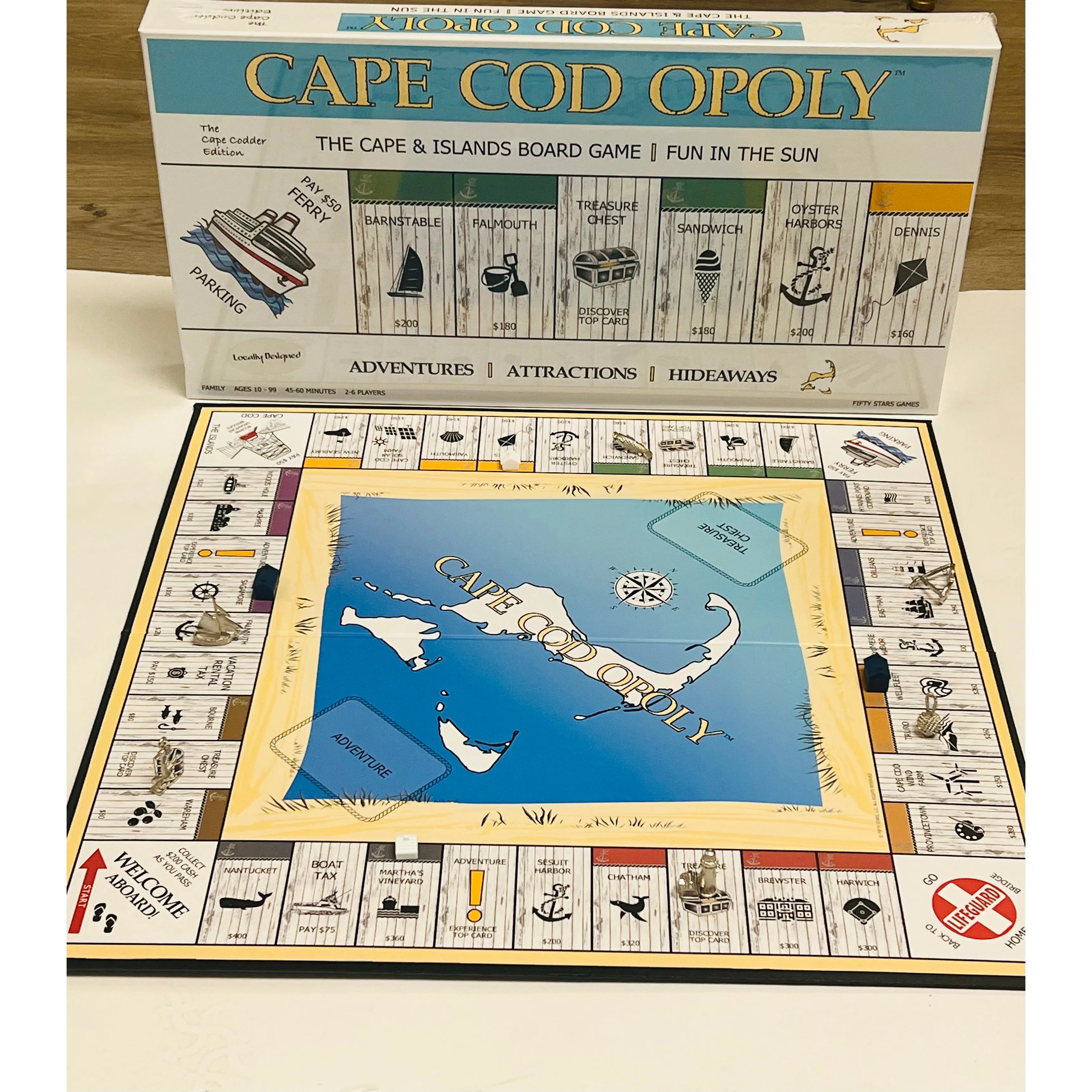 Locally designed, this a Cape Cod Opoly game has all of your favorite adventures, attractions and hideaways.  Move around the board with your favorite nautical game piece as you buy up your favorite Cape Cod properties and build beach cottages and Cape Cod houses.